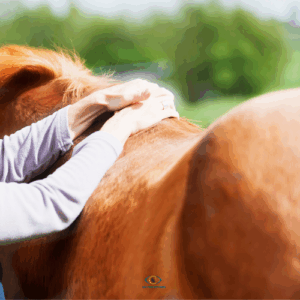 In plaats van te wrijven of te duwen, blijf met een lichte druk aanwezig. Adem rustig door en wacht tot je paard uitademt, likt of zijn hals iets laat zakken. Dat is het moment waarop hij spanning loslaat.